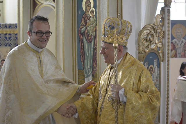 La sosire P.S. Episcop Alexandru a fost întâmpinat cu Sfânta Cruce şi Sfânta Evanghelie de pr. Nicolae Teodorescu, Protopop şi Vicar Foraneu de Timişoara şi de pr. Sabău Gabriel-Simion, administrator parohial al acestei parohii şi paroh la Petroman. Copiii parohiei şi-au întâmpinat Ierarhul cu flori, pâine şi sare, conform tradiției.