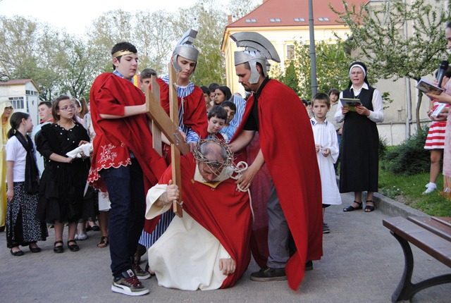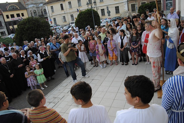 După aceste momente rugăciunea sub formă de scenetă s-a mutat afară în jurul catedralei sub forma unei procesiuni solemne, care-i avea în frunte pe tinerii actori. A fost foarte mişcătoare purtarea Crucii de la o staţiune la alta; biciuirea, căderile sub cruce „batjocurile”, întâlnirea cu Sfânta Fecioară, cu Veronica, cu femeile evlavioase care-l mângâiau, dar şi cu Simon care cu multă dăruire L-a ajutat să ducă Crucea. Cu durere am asistat la dezbrăcarea lui Isus de haine, pironirea pe cruce şi moartea pe cruce.