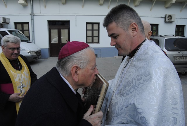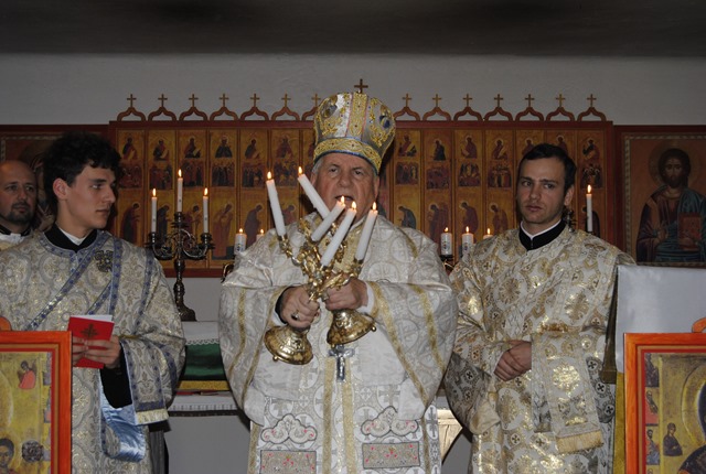La sosire, Prea Sfinţitul Alexandru a fost întâmpinat cu Sfânta Evanghelie şi Sfânta Cruce de pr. Radu Vorindan, Protopop de Arad, de pr. Sorin Seviciu, parohul locului precum şi de alţi preoţi.